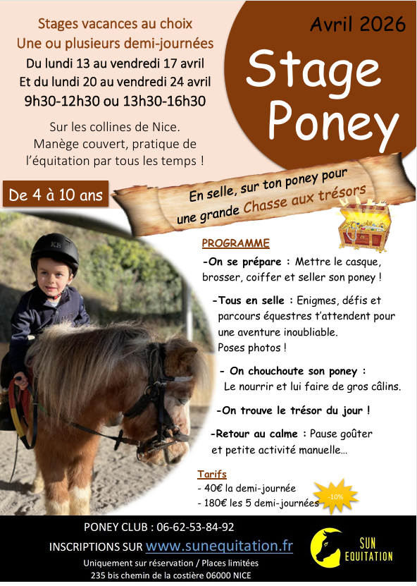 Notre priorité le plaisir et le loisir, au poney club Sun Equitation, c'est apprendre tout en s'amusant autour de nombreux thèmes tous plus chouettes les uns que les autres: Indiens, Cow-boys, Licorne, Chasse au trésor, Cirque, Princesses et Chevaliers...